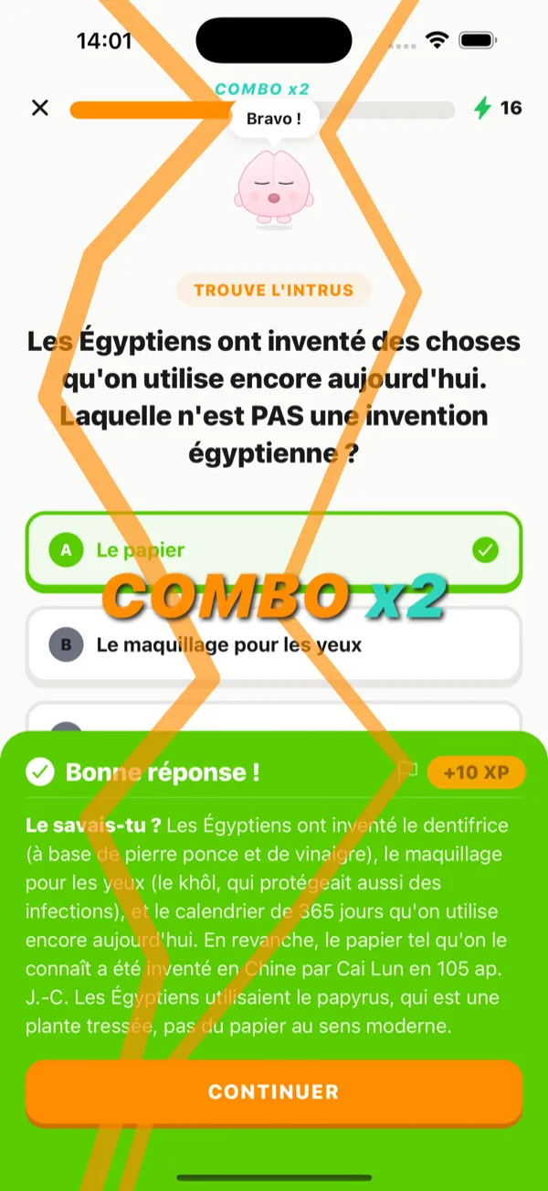 Enchaîne 5 bonnes réponses pour activer les combos et multiplier tes gains d'XP.