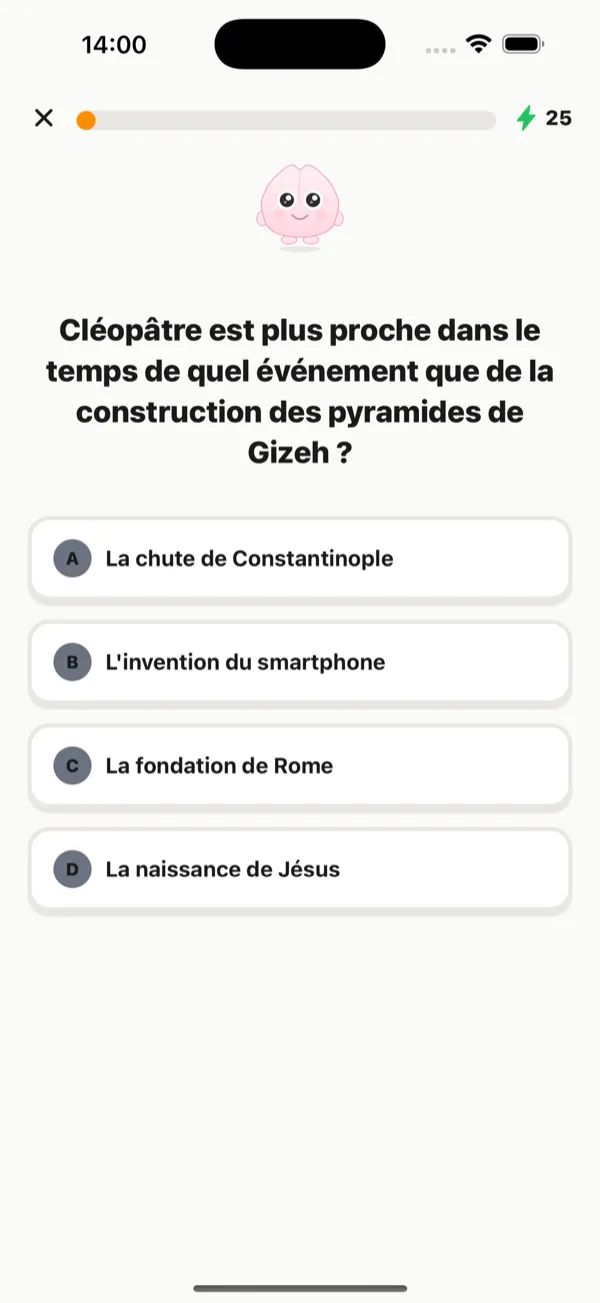 Apprends la culture générale en t'amusant avec des quiz adaptatifs, des combos addictifs et un système de progression qui te pousse à revenir chaque jour.